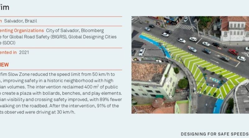 O guia destaca a Zona 30 do Bonfim, implementada em 2021 em Salvador, como um exemplo de transformação urbana voltada à redução de velocidades e ao resgate do espaço público. A iniciativa reduziu o limite de velocidade de 50 km/h para 30 km/h, requalificou 400 m² de espaço e criou uma nova praça equipada com bancos, mobiliário urbano e elementos de lazer.