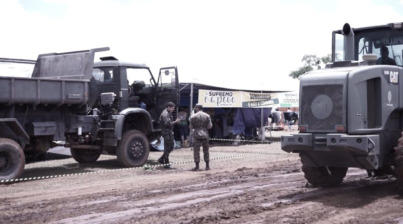 Os vídeos mostram uma retroescavadeira e um caminhão sendo pilotados e orientados por militares para realizar a terraplanagem de uma área que estava repleta de lama e onde estavam instaladas barracas dos manifestantes.