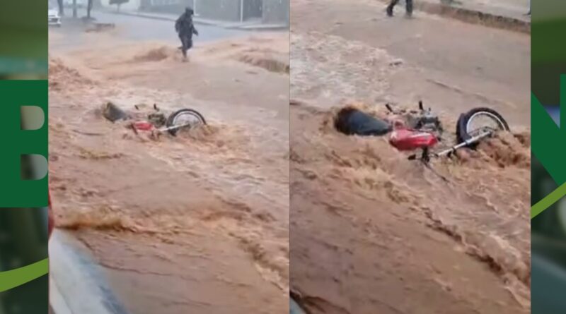 VÍDEO: Moto é arrastada pelas fortes chuvas que transforam ruas em rios no sudoeste baiano