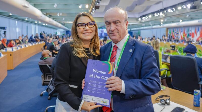 A primeira-dama Rosângela da Silva, a Janja, com o secretário-geral da OEI, o espanhol Mariano Jabonero, na reunião do G-20
