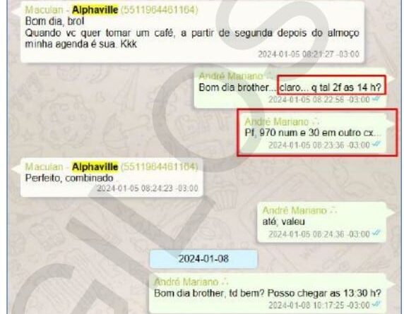 Conversas de WhatsApp obtidas pela Polícia Federal mostram que Cafu compartilhou dados de contas bancárias de outras pessoas e empresas para Mariano, que fez pagamentos de R$ 2,2 milhões, em transferências fracionadas, e depois enviou comprovantes das transações.