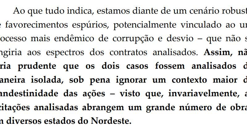 A análise se concentrou em dois contratos públicos firmados em Itarema e Aracaú, ambas no litoral cearense, cidades administradas por familiares do deputado, e encontrou irregularidades em contratos de pavimentação do Departamento Nacional de Obras Contra a Seca (DNOCS) financiados com emendas destinadas por Robério.