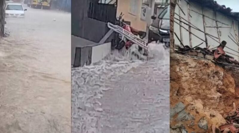 Uma chuva intensa atingiu Medeiros Neto, no Extremo Sul da Bahia, na tarde desta quinta-feira (4). O temporal provocou o desabamento de uma casa e deixou dez pessoas desalojadas, segundo informações confirmadas pela Defesa Civil do município. Vídeos feitos por moradores mostram alagamentos e enxurradas tomando ruas da cidade.