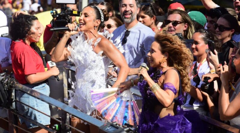 O momento mais alto do desfile veio logo em seguida, quando Ivete Sangalo convidou Daniela Mercury para subir ao trio e cantar com ela, deixando clara a admiração que sente pela artista: “deixa eu chamar a Rainha do Axé para cantar comigo”.