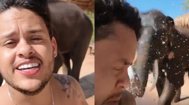 VÍDEO: De férias na Ásia, Thiago Aquino é surpreendido pela tromba de elefante