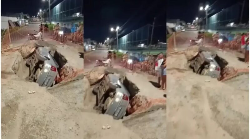 Um carro caiu em um buraco aberto por uma obra na Rua Portuguesa de Desportos, no bairro Parque Ipê, em Feira de Santana, na noite desta quinta-feira (5). O buraco fica ao lado de um terreno conhecido como Campo da Baixada.