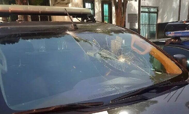O impacto do objeto arremessado no veículo causou a quebra do para-brisa.