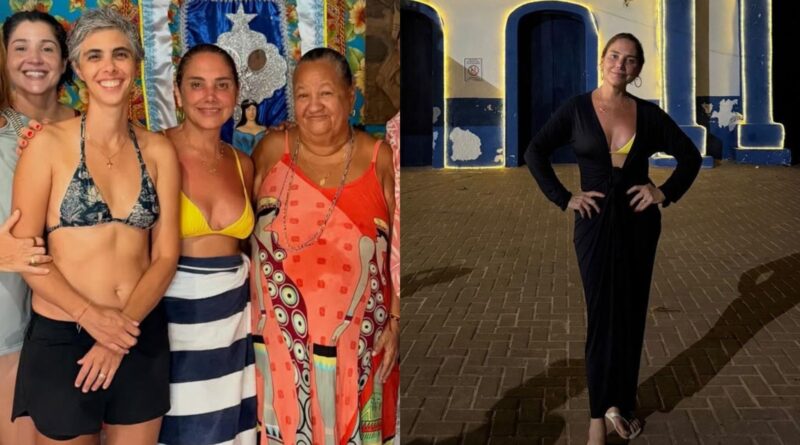 Em clima de férias, ela está em Barra de Jacuípe, onde apareceu ao lado da diretora Letícia Prisco durante visita à Barraca da Jajá, estabelecimento famoso na região.